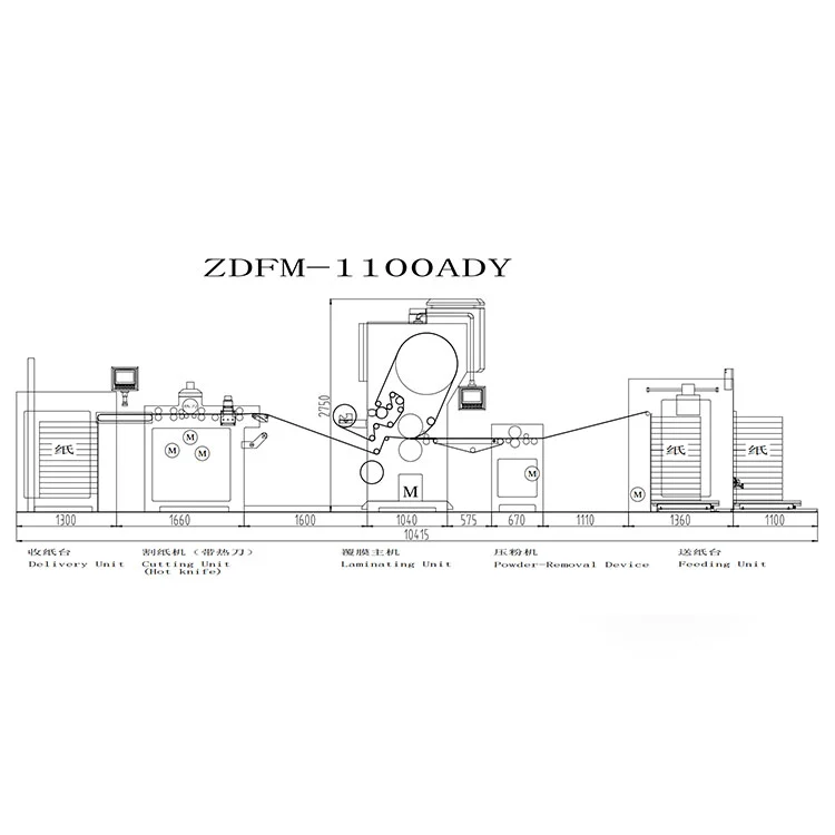 Rengjøring og laminering: Papiret passerer først gjennom en elektrostatisk pulverfjerner for å rengjøre overflaten, og blir deretter presist laminert med en limbelagt film (eller pre-coat-film) under oppvarmede ruller.